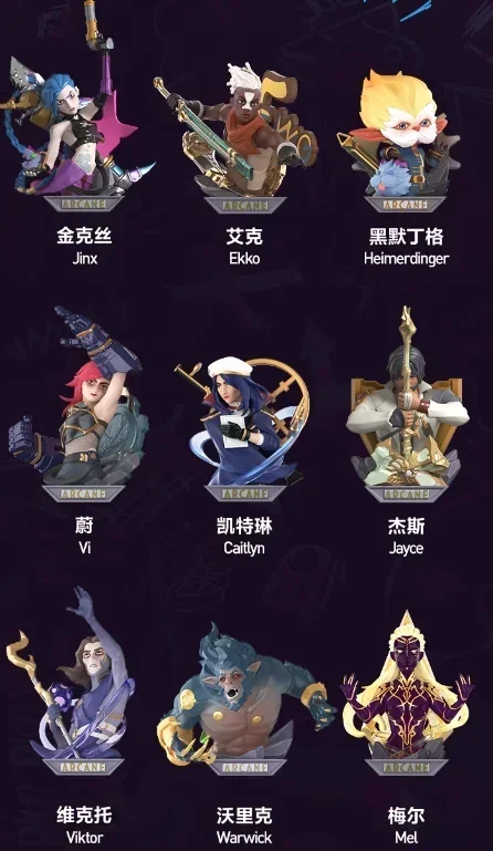 Hidden A, Hidden B, Jayce, Viktor, Warwick, Mel, Ekko, Heimerdinger, Vi, Caitlyn, 1 Blind Box, 9 Blind Boxs, 9 Confirm Style, Jinx
